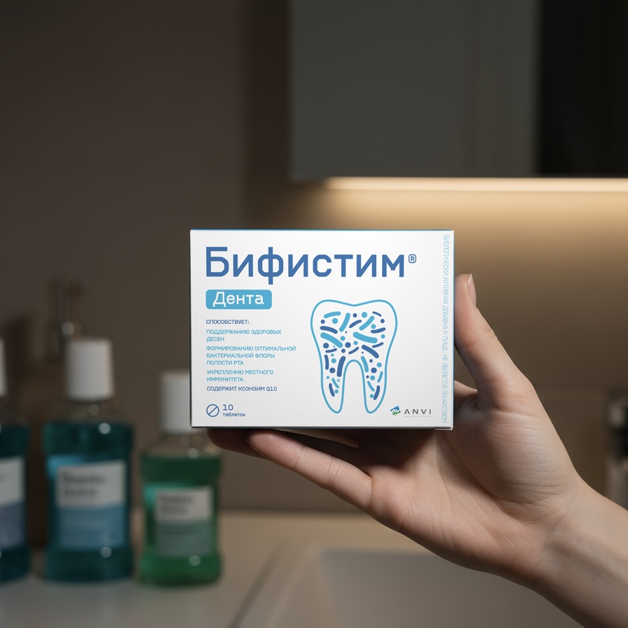 Сбалансировать микрофлору ротовой полости может помочь дентабиотик Бифистим®Дента, который содержит пробиотические штаммы таргетного действия Lactobacillus brevis CECT 7480 и Lactobacillus plantarum CECT 7481.
