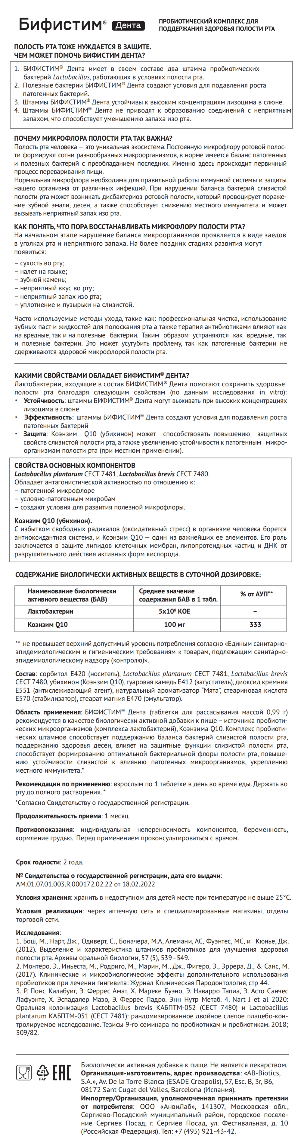 Штаммы лактобактерий Lactobacillus plantarum CECT 7481, Lactobacillus brevis CEСТ 7480 и коэнзим Q10, входящие в состав Бифистим Дента, способствуют поддержанию местного иммунитета, создавая условия для развития полезных и подавления роста патогенных микроорганизмов, являющихся причиной неприятного запаха, зубного налета, кариеса, воспалительных заболеваний полости рта .